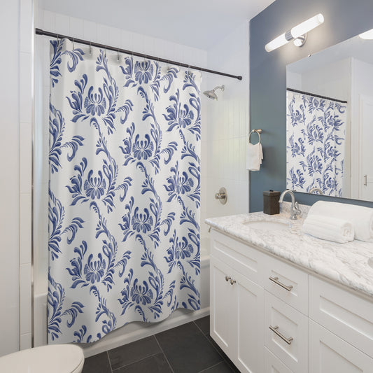 BLUMENMUSTER BLAU • Hochwertiger, Schöner Duschvorhang 180x200 cm Weiss