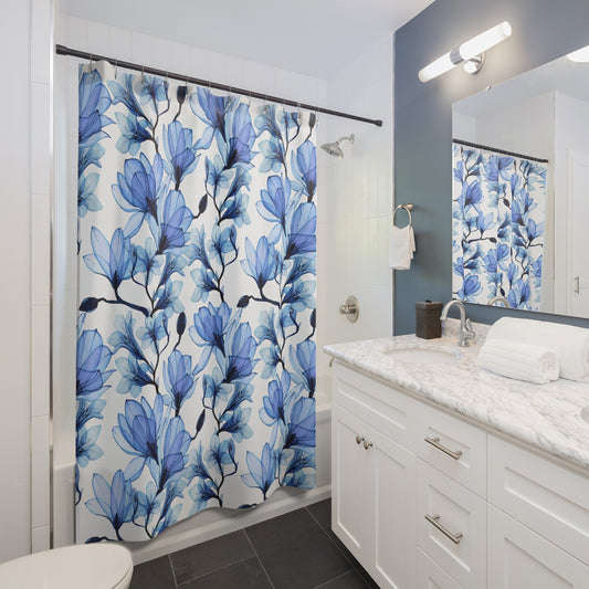 FLORALES BLUES BLUMENMUSTER • Hochwertiger, Schöner Duschvorhang 180x200 cm Weiss
