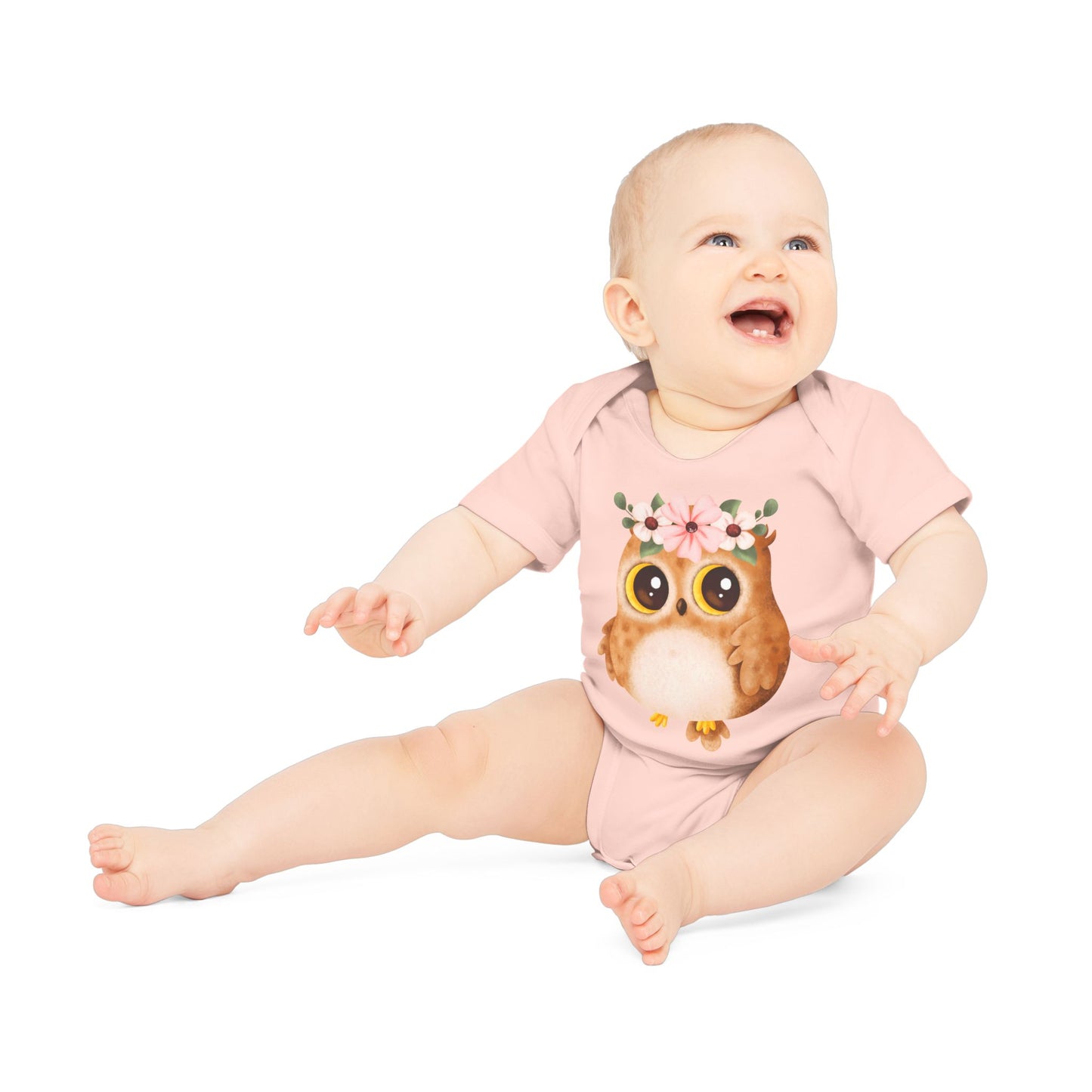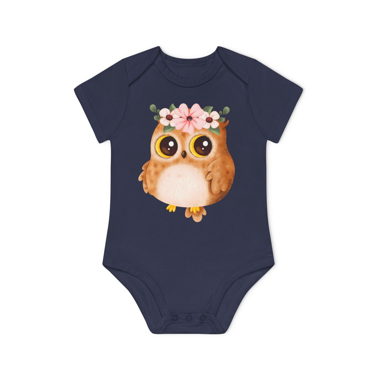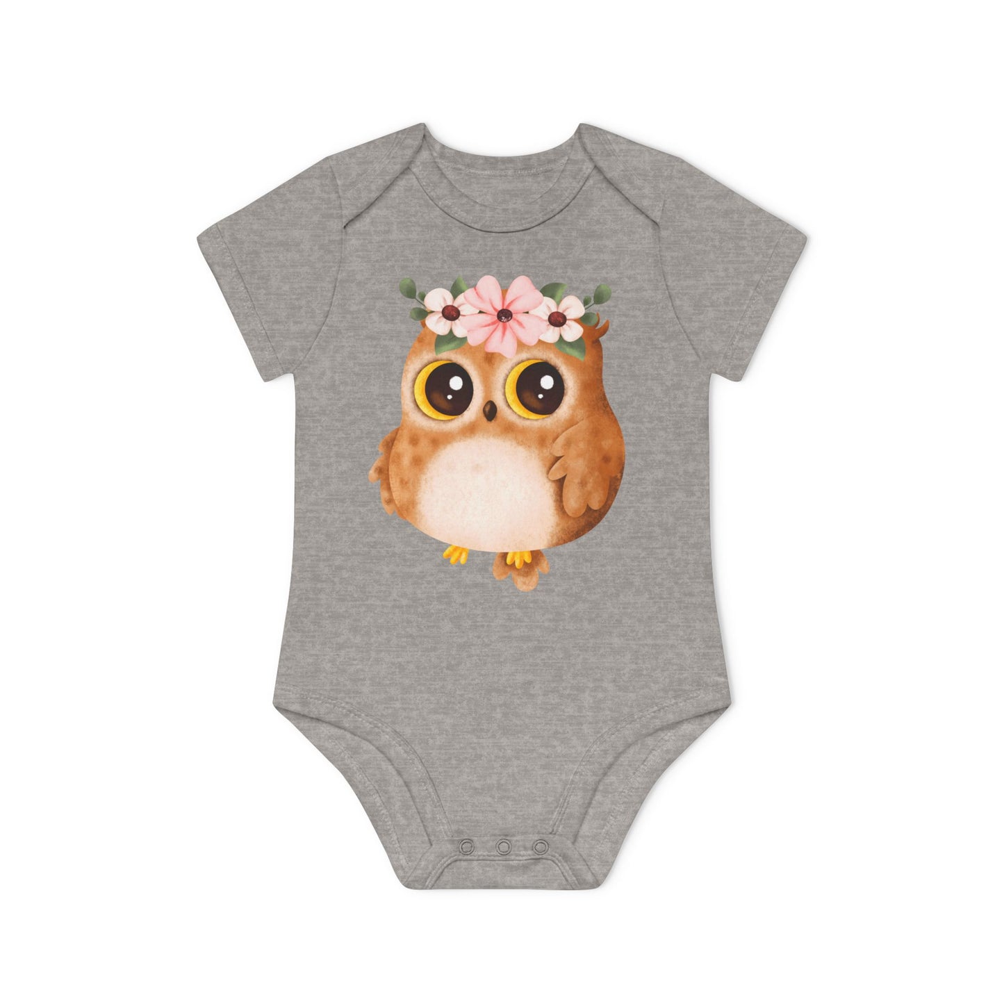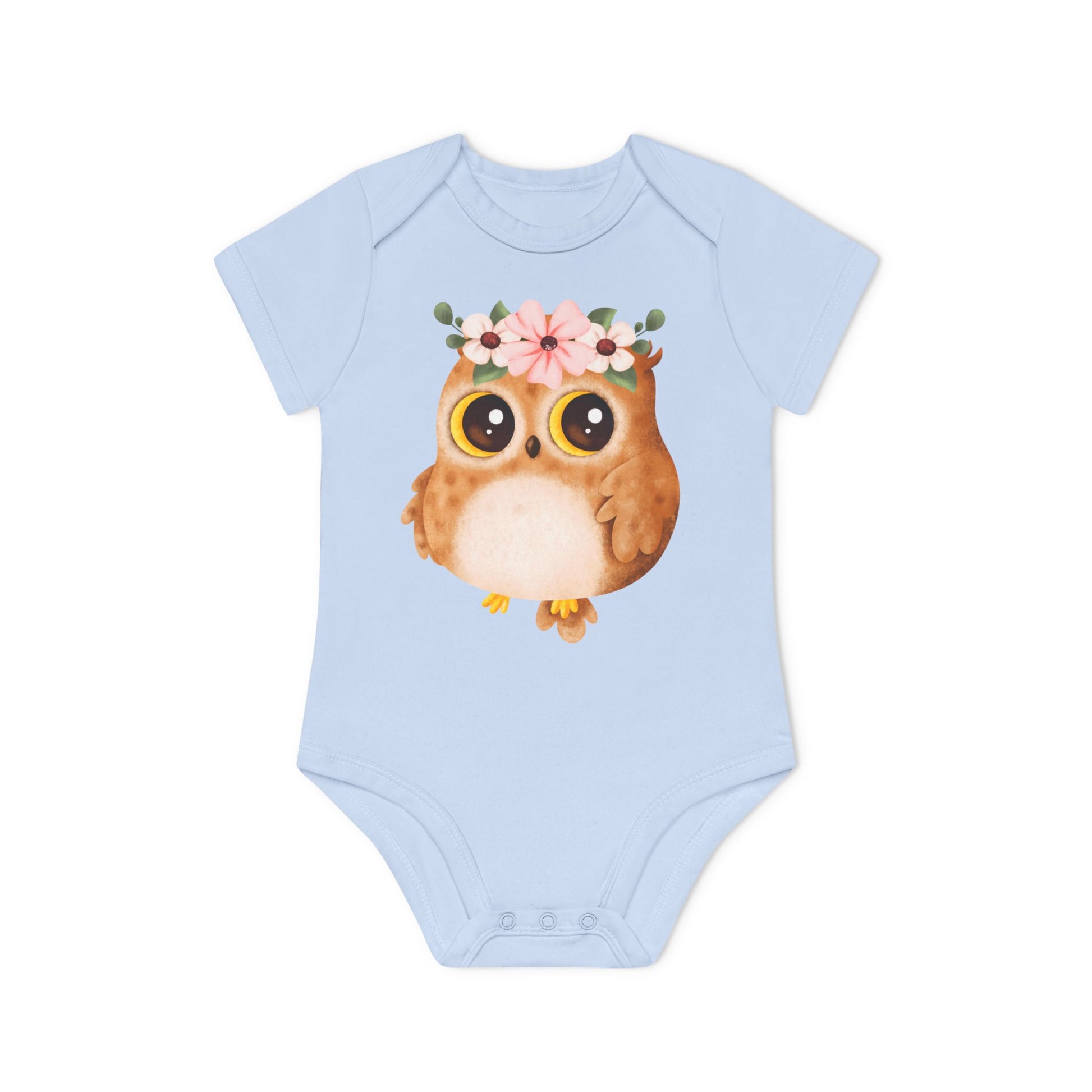 EULE MIT BLUMEN COMIC ZEICHNUNG • Niedlich süßer Baby Body Kurzarm • Mädchen & Jungen • BIO Baumwolle 🌿