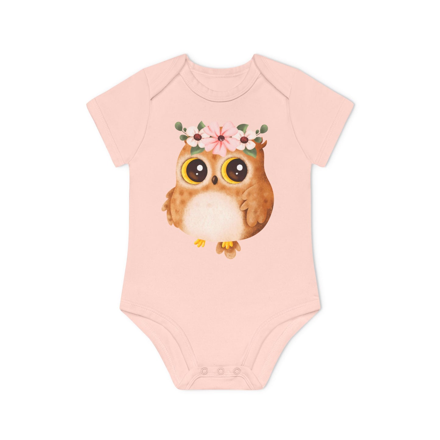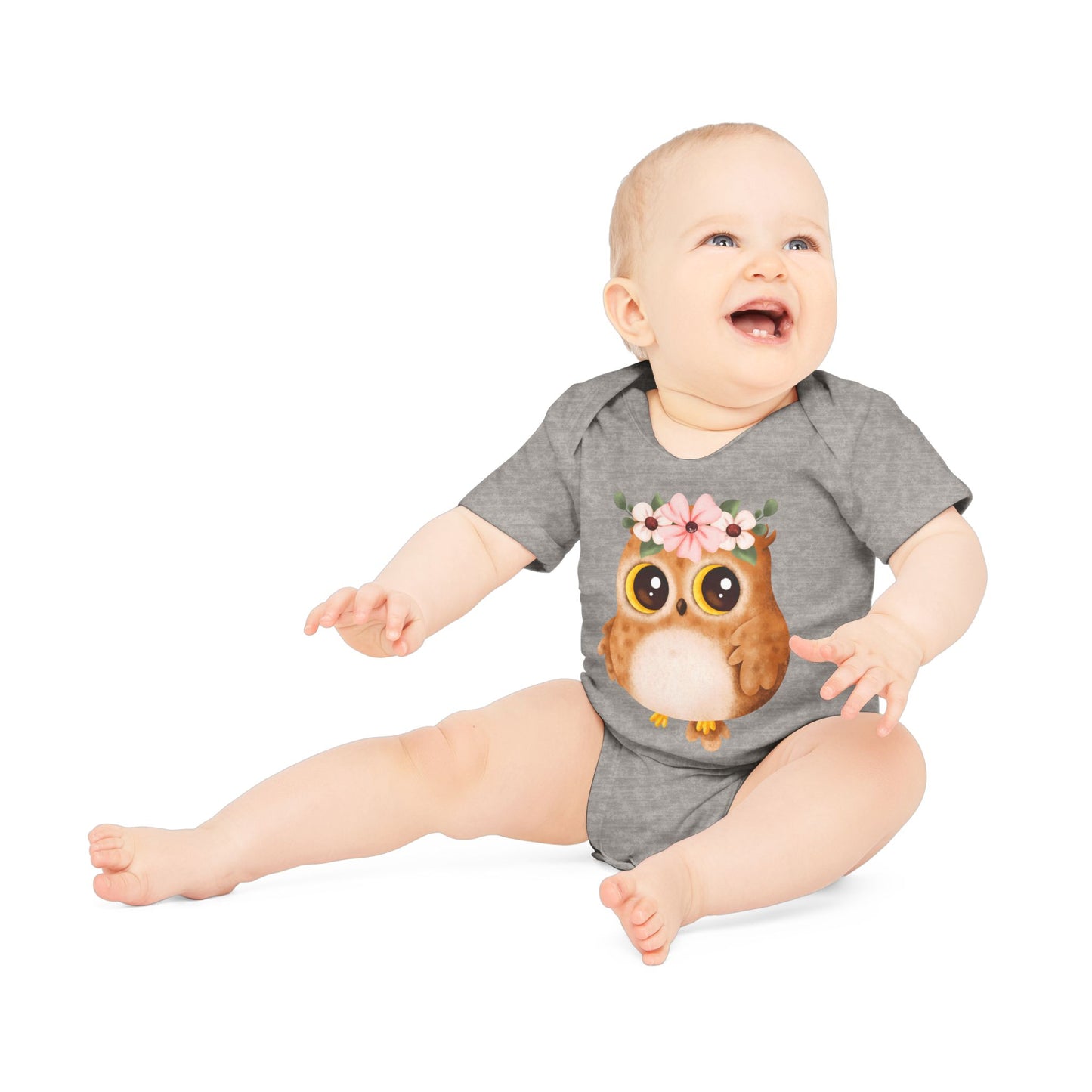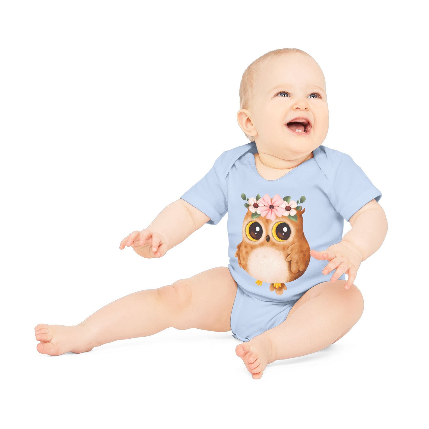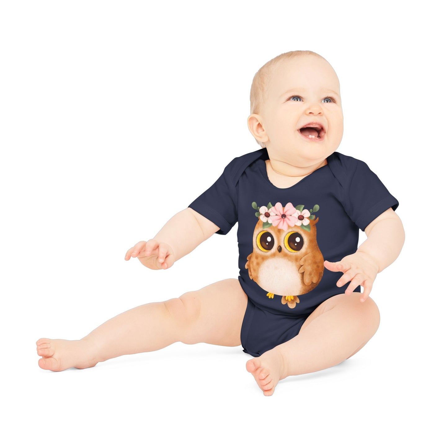 EULE MIT BLUMEN COMIC ZEICHNUNG • Niedlich süßer Baby Body Kurzarm • Mädchen & Jungen • BIO Baumwolle 🌿