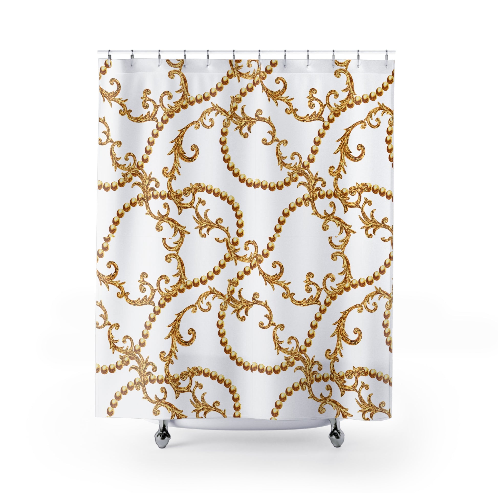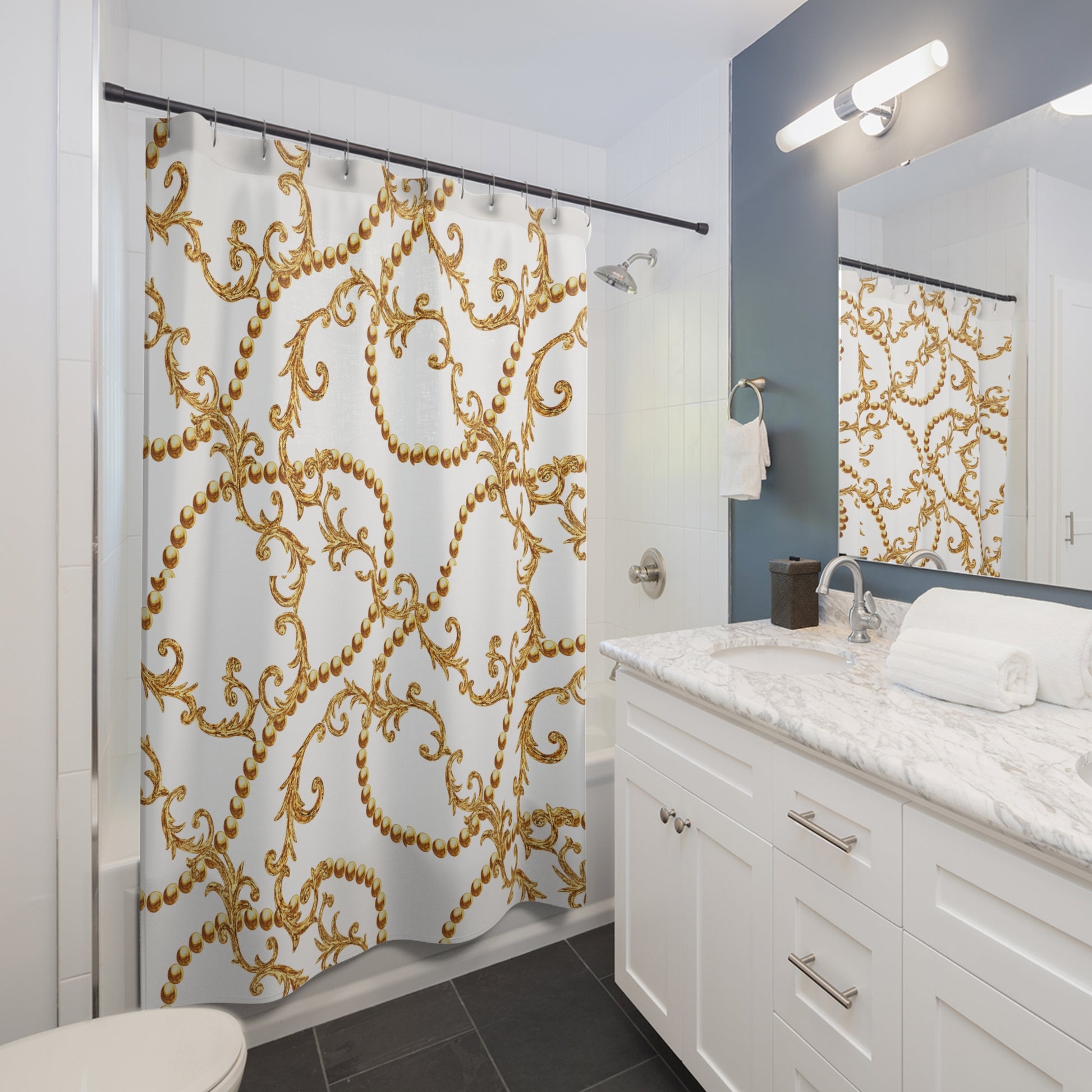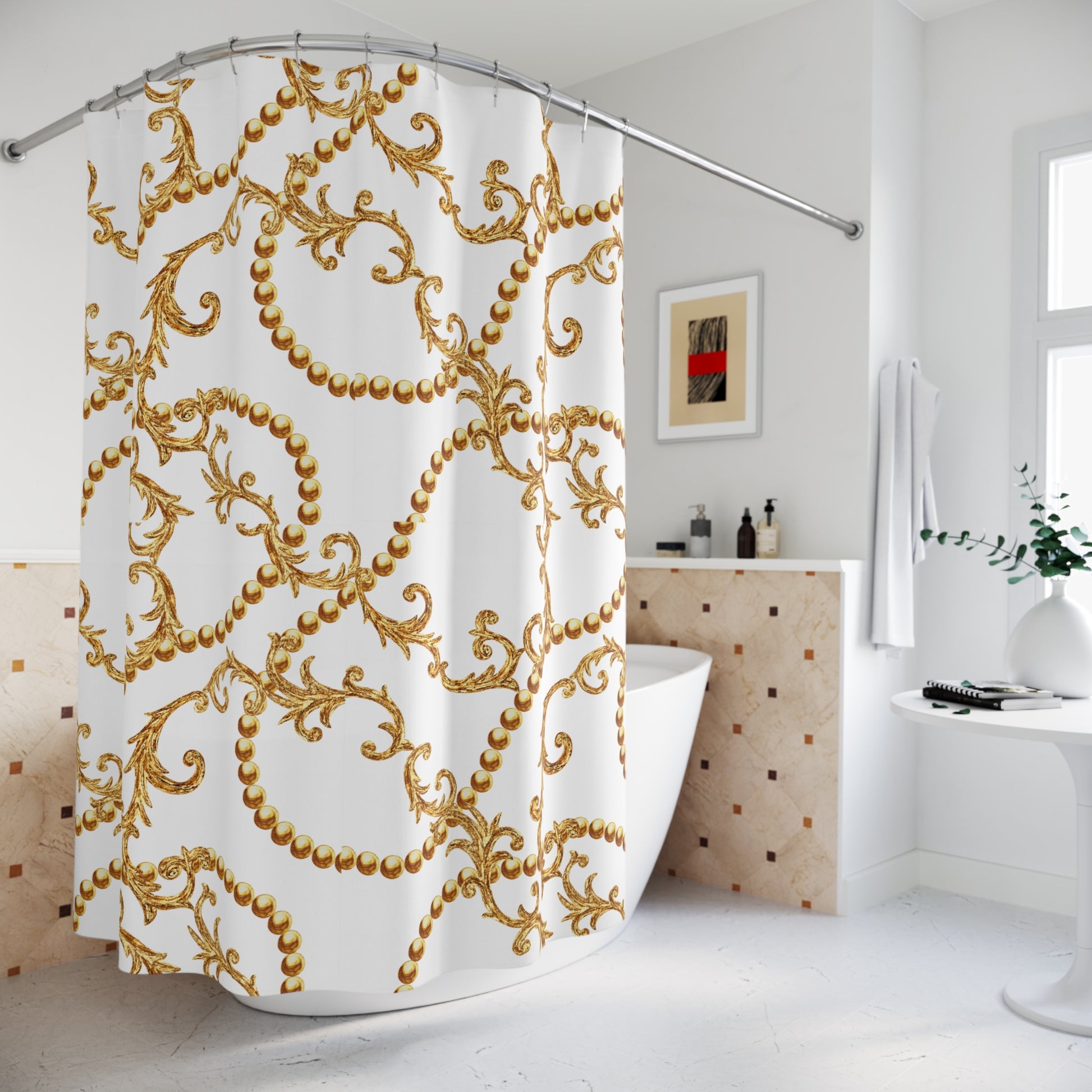 LUXUS VORHANG - BAROCK FLORALER GOLDSCHMUCK • Hochwertiger, Schöner Duschvorhang 180x200 cm Weiss