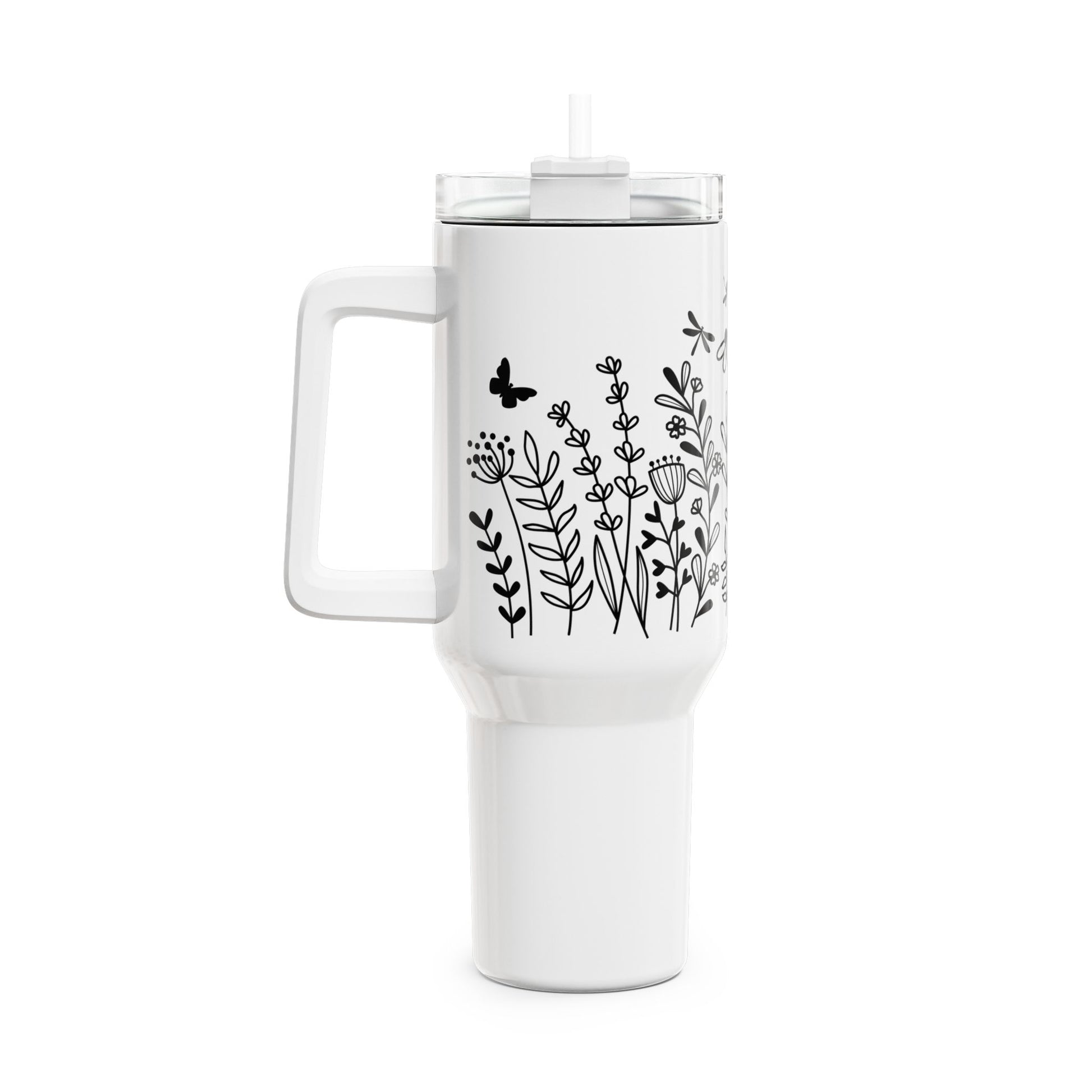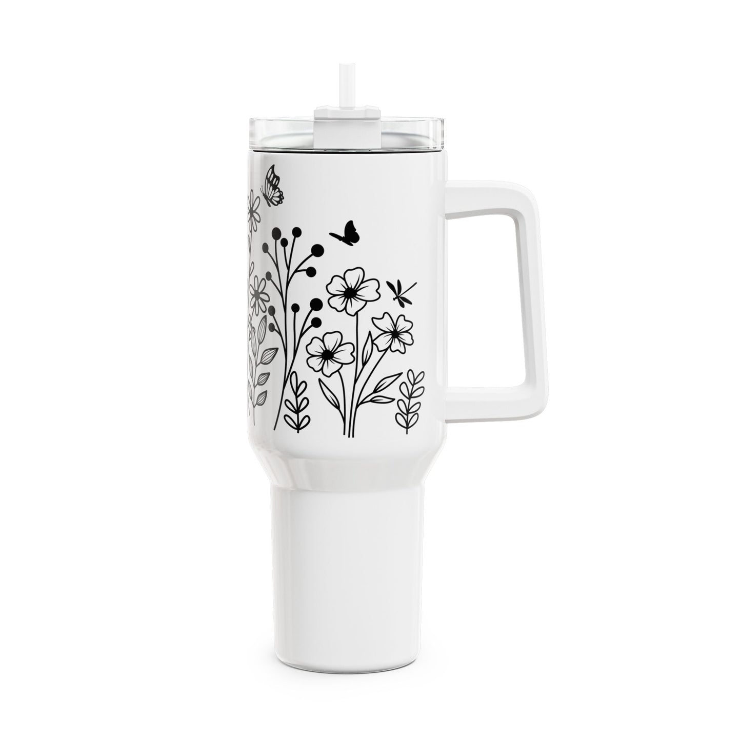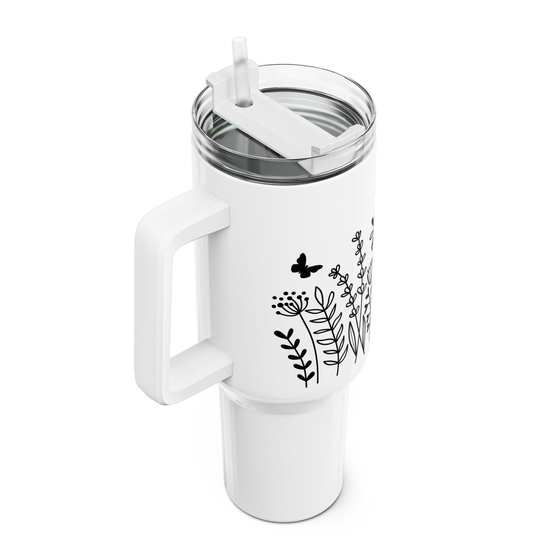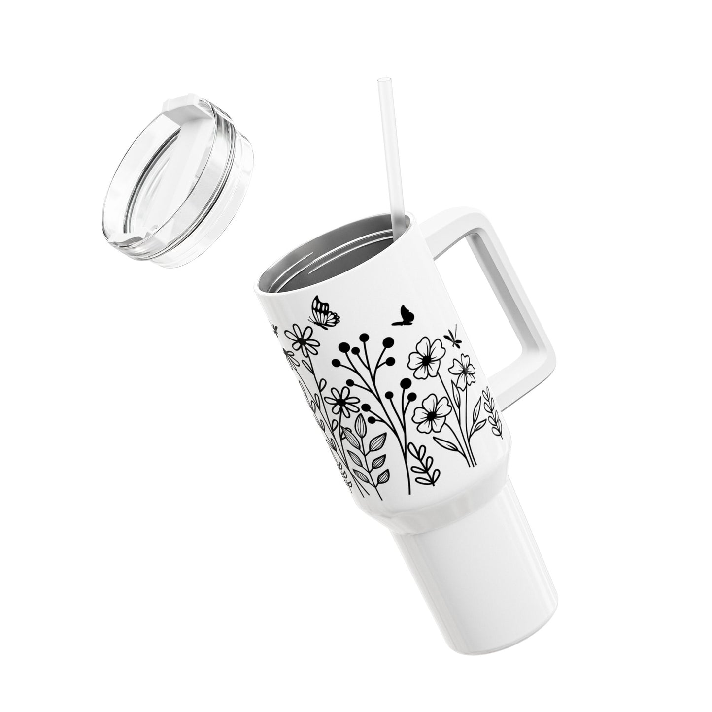 SCHMETTERLINGS BLUMEN WIESE NIEDLICH • Tumbler mit Henkel & Strohhalm • XXL Reisebecher 1,2L